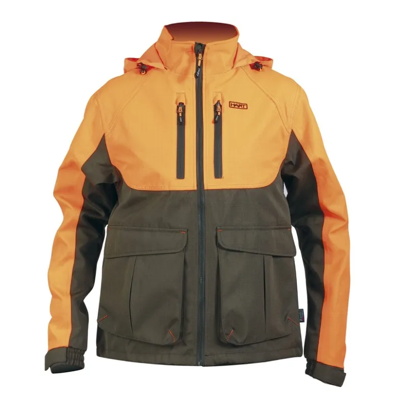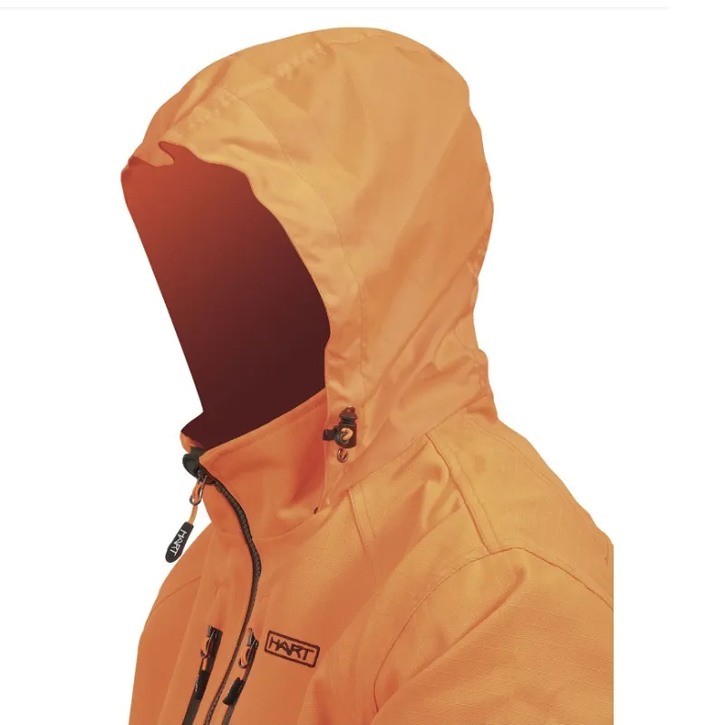 Strong rip stop reinforced waterfroof jacket with blaze color combination for active hunting.