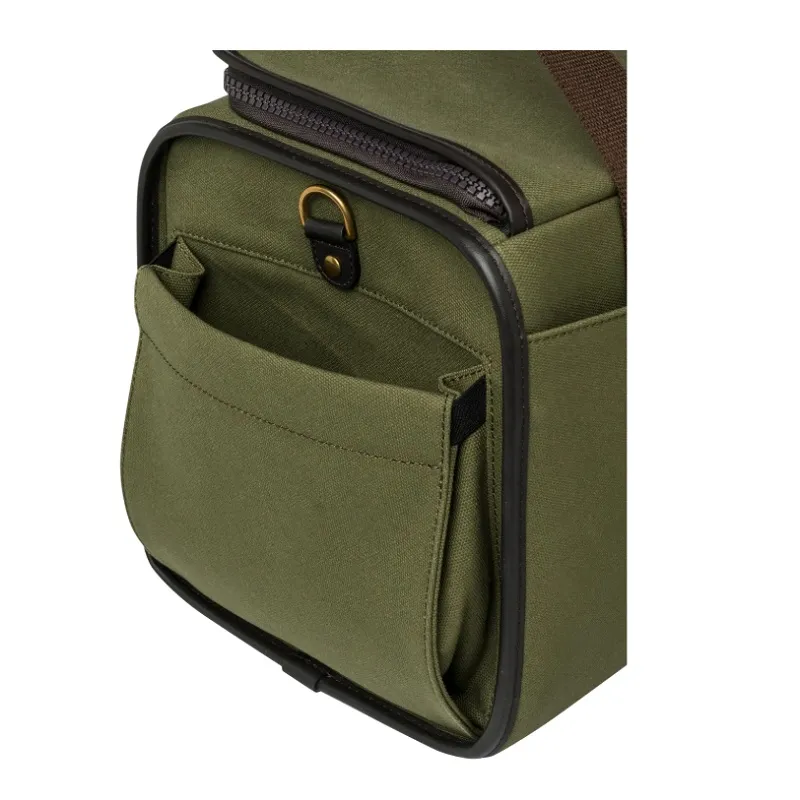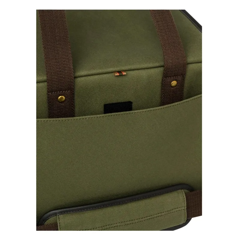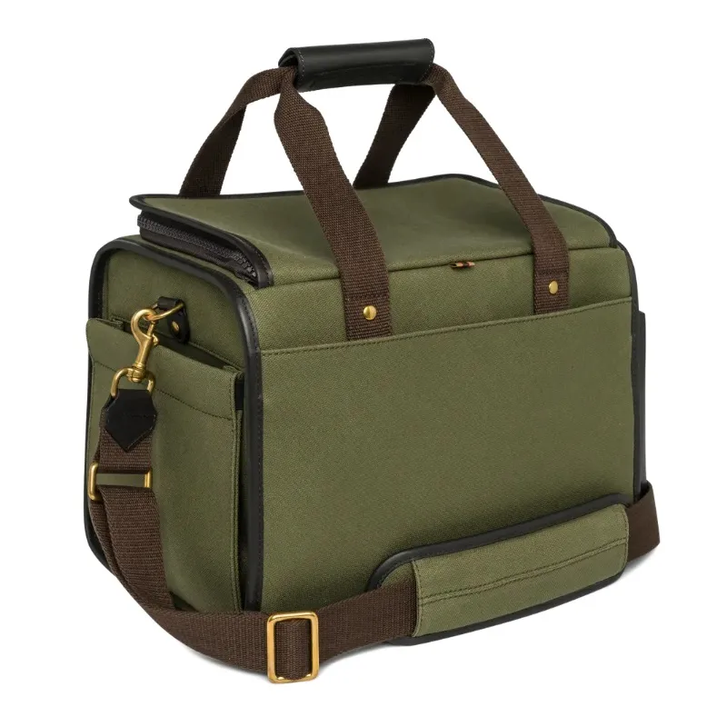 Field bag ideal for both clay shooting and hunting. Made of durable canvas with leather details, it is designed to carry approximately 150 cartridges.